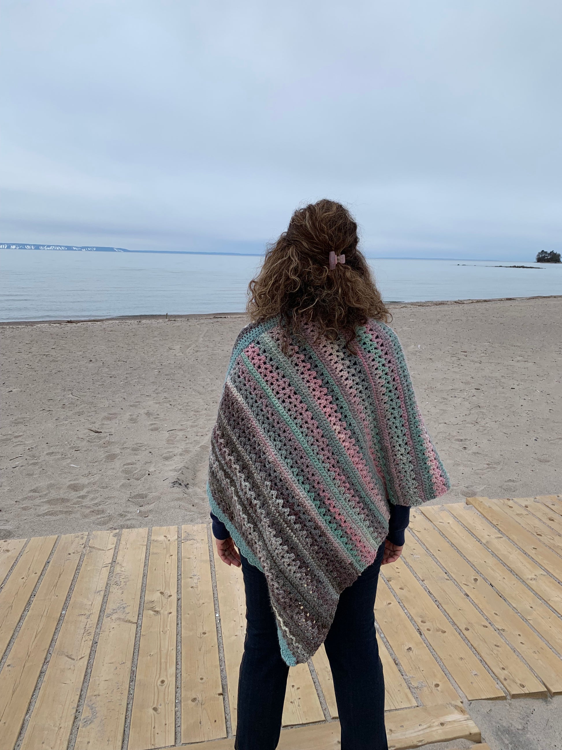 Shades of light colours poncho , very suitable for fall and spring breezes.