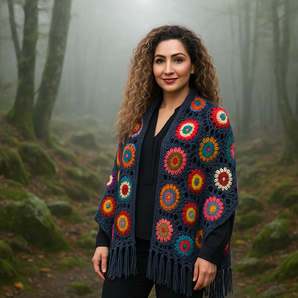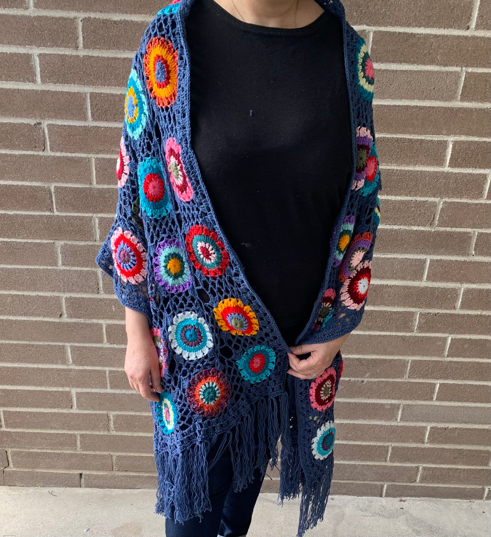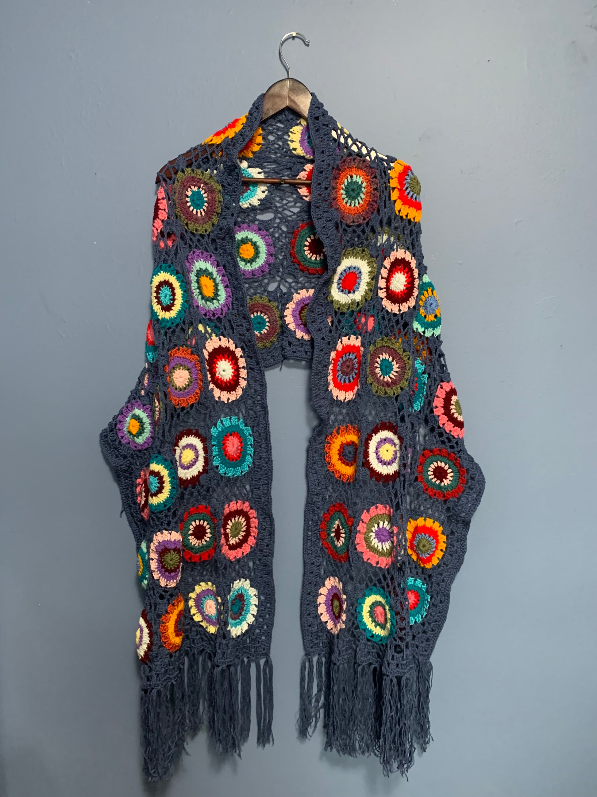 Colourful granny squares shawl made of soft and thin cotton material.